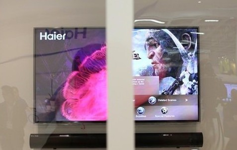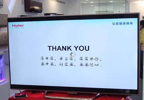55英寸OLED TV:此款产品是海尔首款OLED电视,尺寸为55英寸,分辨率为1080p全高清,边框1.5毫米,面板厚度4毫米。底座设计得非常巧妙,完全被隐藏在了屏幕的背面。配置了无需换台就能浏览节目内容的“TVnow2.0智能电视交互方式”。海尔还首次提出“社交电视”概念,让用户在观看的同时,与好友实时互动。